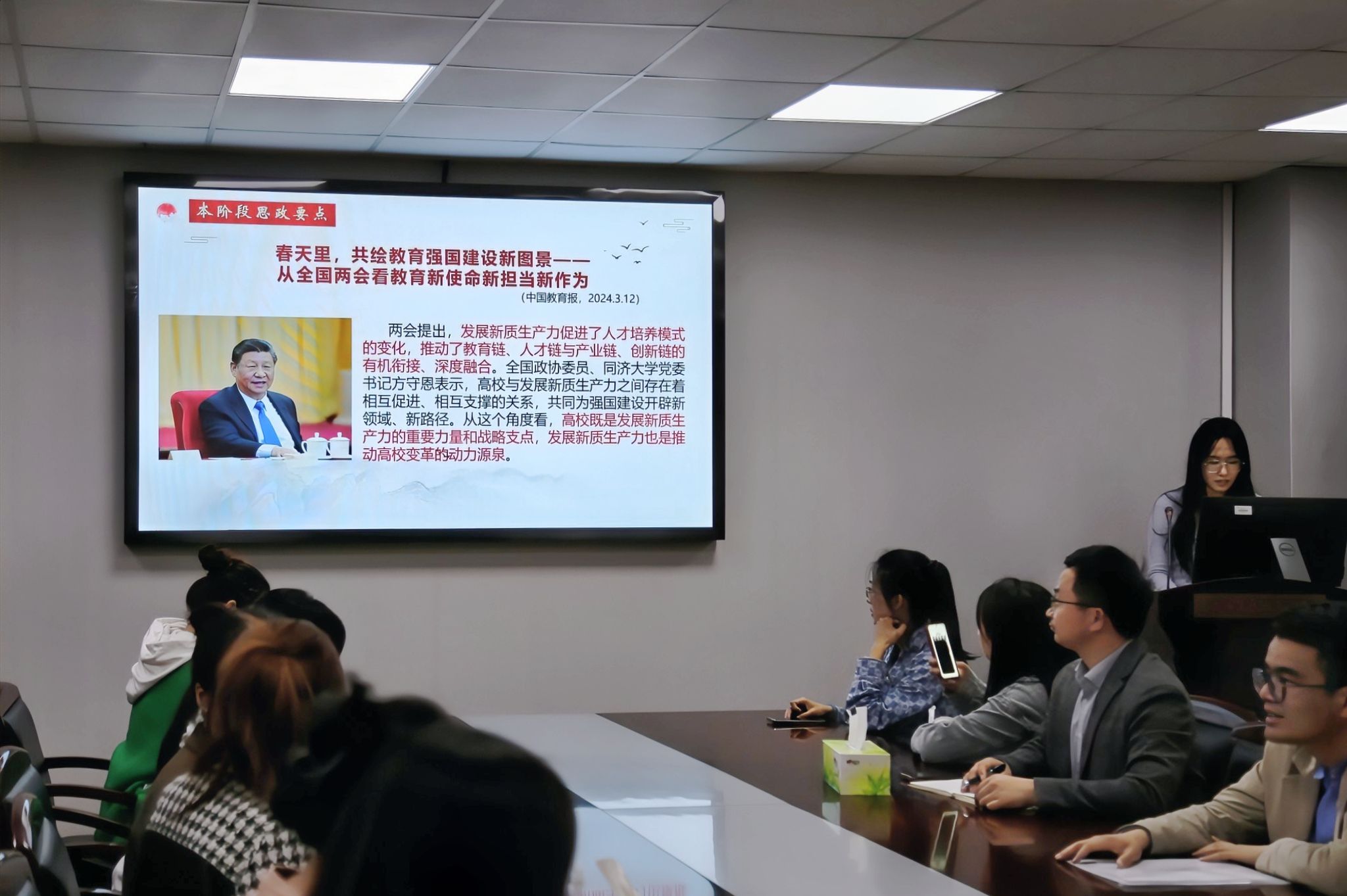 在“学习摘要”中,人文成人电影辅导员潘昕仪介绍了本阶段的思政要点,强调坚持把立德树人作为中心环节,把高质量发展作为各级各类教育的生命线,把思想政治工作贯穿教育教学全过程,加强全民国防教育,加大高校毕业生就业支持力度,努力开创我国高等教育事业发展新局面。同时,积极响应两会发展新质生产力的号召,让高校成为发展新质生产力的重要力量和战略支点,促进新质生产力成果的传播和应用,以推动高校变革和科研水平的提升,共绘教育强国建设新图景。